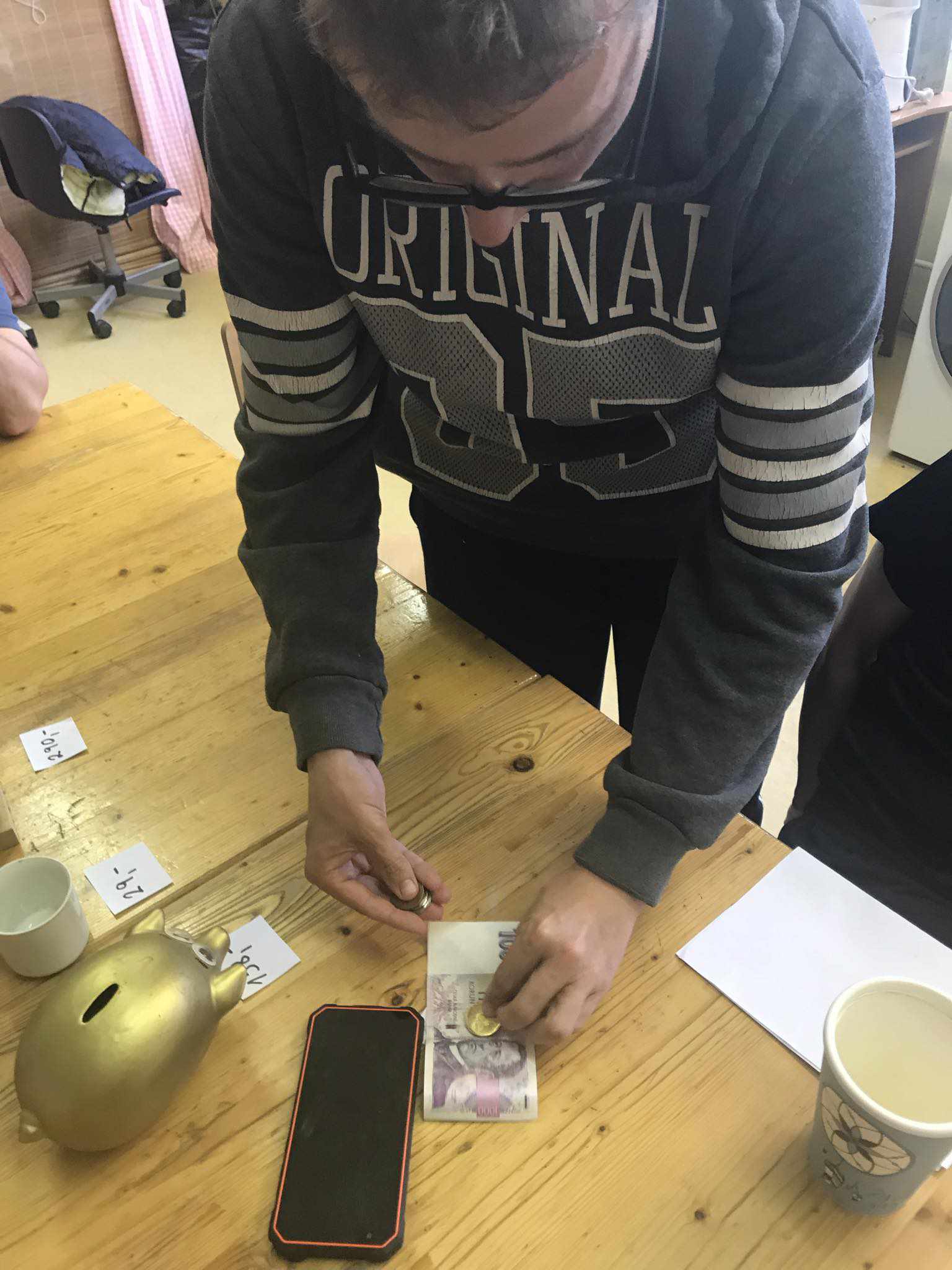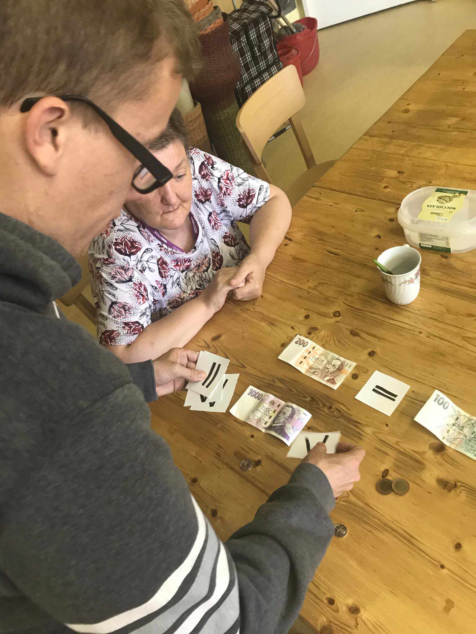 Klienti z tréninkového bydlení se učili hospodařit s penězi. Ukazovali si možné situace v obchodě a poznávali hodnotu bankovek. Už teď se těší až si to vyzkouší při nákupu v obchodě.
